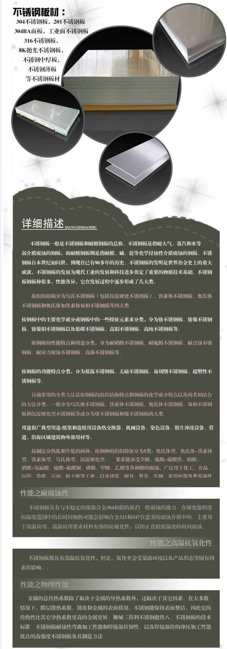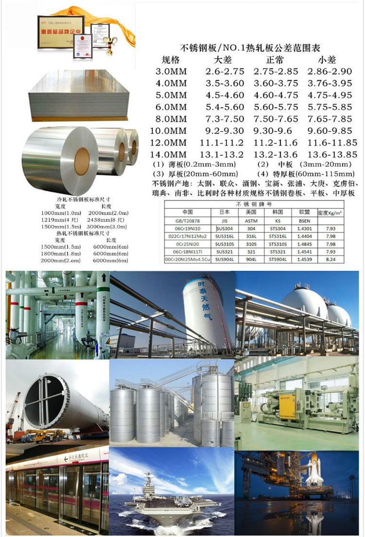 不銹鋼板一般是不銹鋼板和耐酸鋼板的總稱。不銹鋼板是指耐大氣、蒸汽和水等弱介質腐蝕的鋼板,而耐酸鋼板則是指耐酸、堿、鹽等化學浸蝕性介質腐蝕的鋼板。不銹鋼板自本世紀初問世,不銹鋼板的發展為現代工業的發展和科技進步奠定了重要的物質技術基礎。不銹鋼板鋼板種很多,性能各異,它在發展過程中逐步形成了幾大類。按組織結構分為奧氏體不銹鋼板、馬氏不銹鋼板(包括沉淀硬化不銹鋼板)、鐵素體不銹鋼板、和奧氏體加鐵素體雙相不銹鋼板等四大類?按鋼板中的主要化學成分或鋼板中的一些特征元素來分類,分為鉻不銹鋼板、鉻鎳不銹鋼板、鉻鎳鉬不銹鋼板以及低碳不銹鋼板、高鉬不銹鋼板、高純不銹鋼板等。按鋼板的性能特點和用途分類,分為耐硝酸不銹鋼板、耐硫酸不銹鋼板、耐點蝕不銹鋼板、耐應力腐蝕不銹鋼板、高強不銹鋼板等。按鋼板的功能特點分類,分為低溫不銹鋼板、無磁不銹鋼板、易切削不銹鋼板、超塑性不銹鋼板等。現常用的分類方法是按鋼板的組織結構特點和鋼板的化學成分特點以及兩者相結合的方法分類。一般分為馬氏體不銹鋼板、鐵素體不銹鋼板、奧氏體不銹鋼板、雙相不銹鋼板和沉淀硬化型不銹鋼板等或分為鉻不銹鋼板和鎳不銹鋼板兩大類。用途很廣典型用途:紙漿和造紙用設備熱交換器、機械設備、染色設備、膠片洗沖設備、管道、沿海區域建筑物外部用材等。